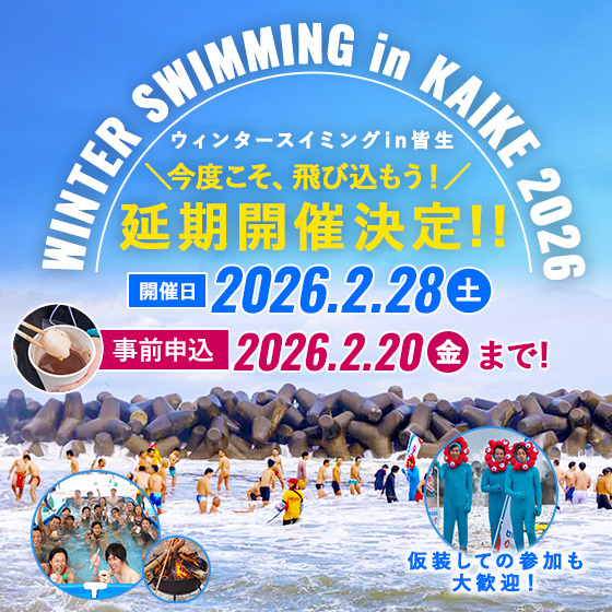 当初1月10日に開催されるはずの毎年恒例のWINTER SWIMMING in KAIKEですが、1月6日に発生した地震を鑑みて中止されていましたが、現在状況も落ち着いていることから延期開催を実施することとなりました